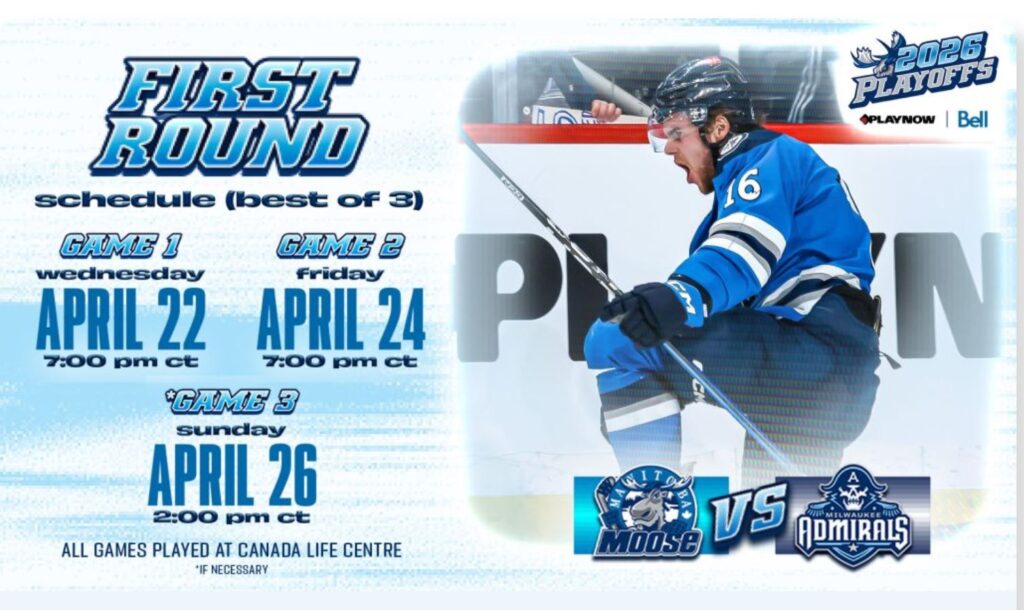 9. Moose: The Manitoba Moose will host the best-of-3 opening playoff round versus Milwaukee on April 22 at Canada Life Centre.